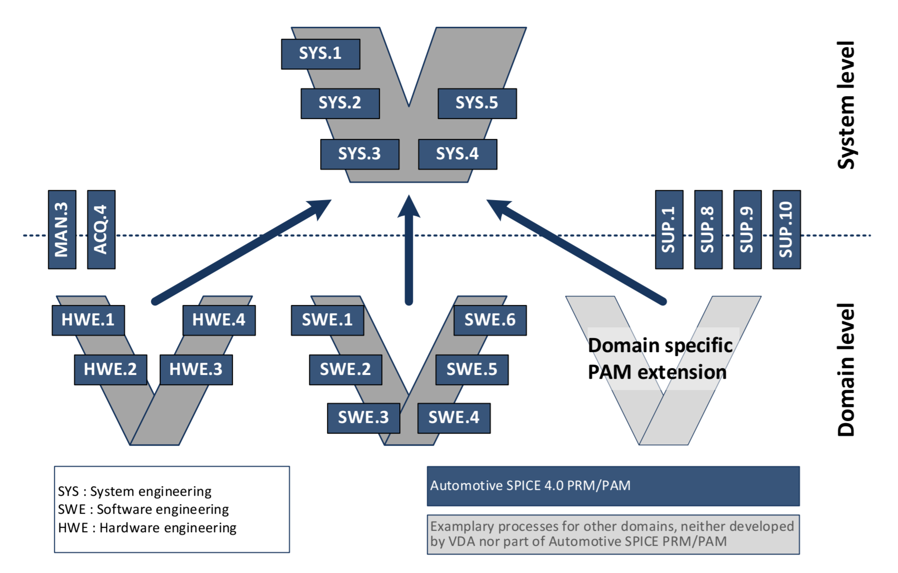 시스템 엔지니어링(SYS) 프로세스를 V-모델의 최상위에 두고, 개발하려는 제품의 특성에 따라 필요한 도메인 프로세스를 플러그인처럼 결합하는 구조이다.