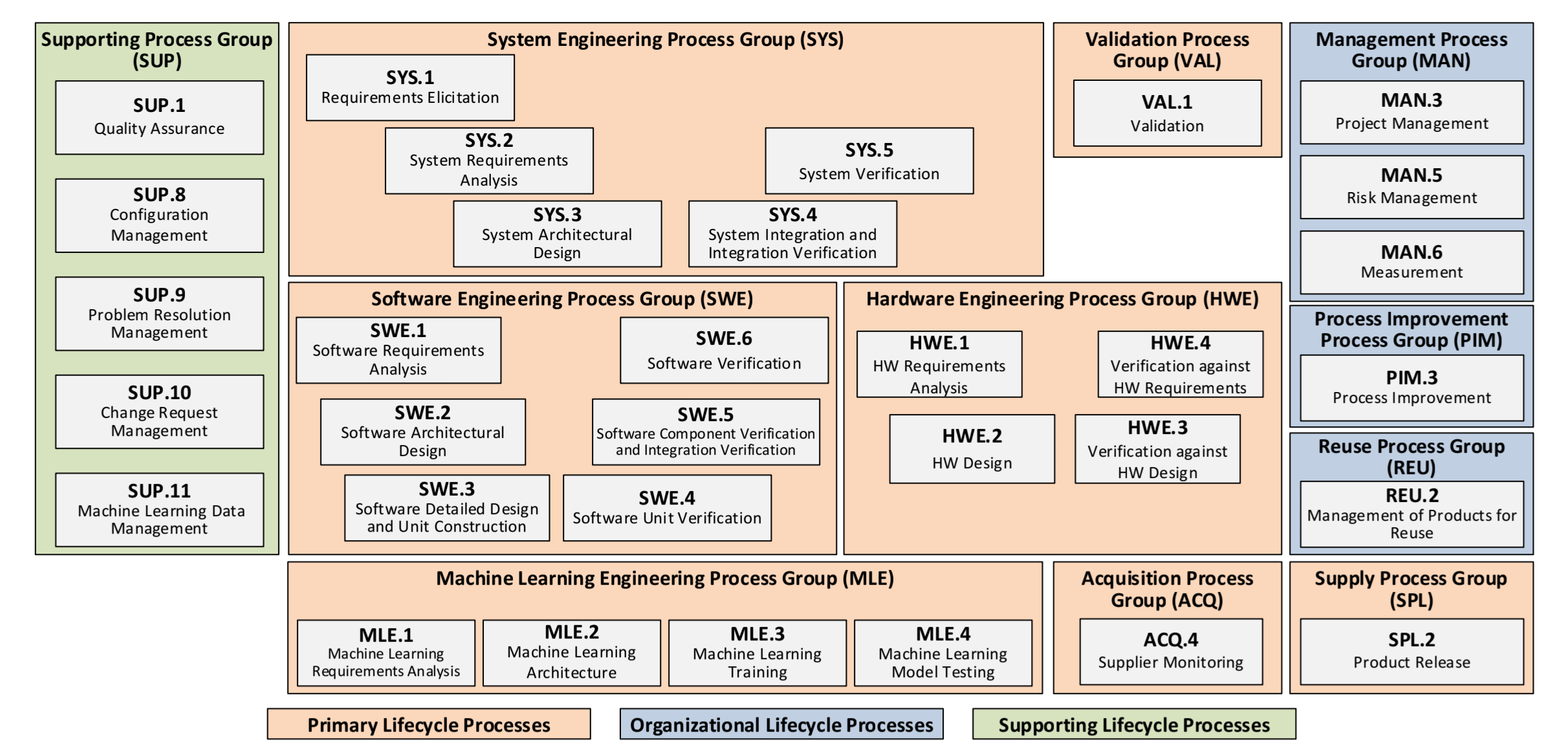 이에 따라 Audi, BMW, VW 등 유럽 OEM 업체들이 연합하여 HIS(Hersteller Initiative Software) 그룹을 구성하였고, ISO/IEC 12207(SW 생명주기)과 ISO/IEC 330xx(프로세스 평가) 표준을 기반으로 자동차 산업에 특화된 Automotive SPICE (ASPICE) 모델을 개발하였다.